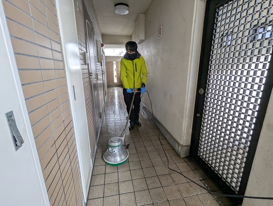 市街地のあるマンション共用部の清掃においては、週2回の床清掃を実施しています。具体的には、掃き清掃と水モップがけを行い、常に清潔な共用部を維持することで、住民が快適に生活できる環境を提供しています。