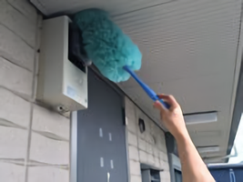 建物の「顔」であるエントランスをはじめ、各室ドアまわりのホコリ払いや拭き掃除、砂ぼこりがたまりやすい笠木や窓台の清掃も行います。私どもの巡回点検清掃では、床面のみではなく、天井のクモの巣や壁まわり等、共用部分を立体的に捉え、それぞれをしっかり清掃していきます。