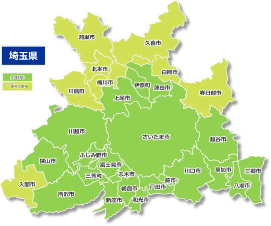 入間市、桶川市、川島町、北本市、久喜市、鴻巣市、白岡市、春日部市